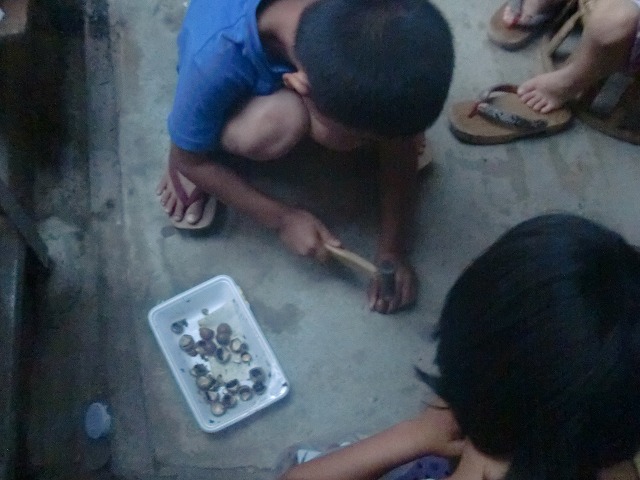 チビちゃん達はおやつのマカダミアンナッツを金槌で男っぽくワイルドに。