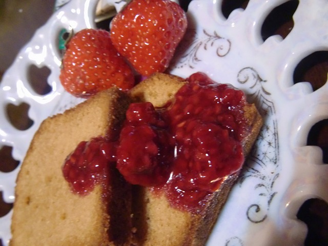 お土産に持って帰ったuraniwa カフェの塩キャラメルケーキにラズベリーソース。