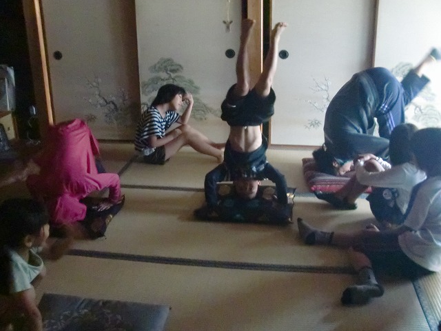 外から帰って座布団と目が合うと各自、黙々と逆立ちの練習。
