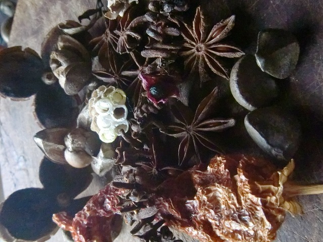 ポポーの種はブリと大きく直ぐに穴が開くので椿の種の殻やスパイスや好みのアクセサリー達と合わせて