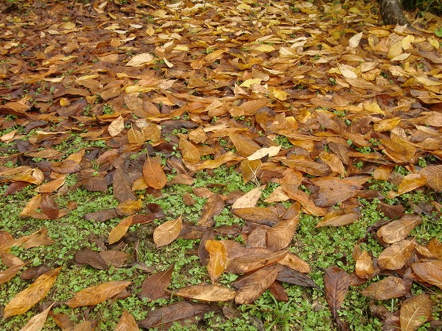 堆肥用にポポーの葉をかき集めて足で踏むと甘い香りがします。