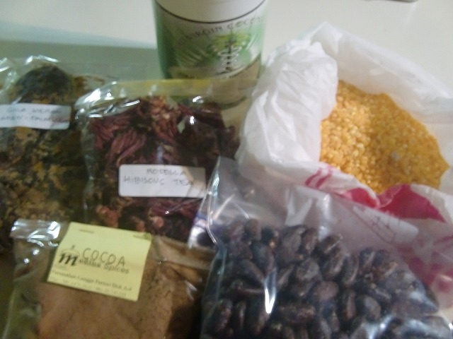 こちらはカカオの実と砕きコーンやドライハイビスカス、タマリンド、レモングラスの粉など。。