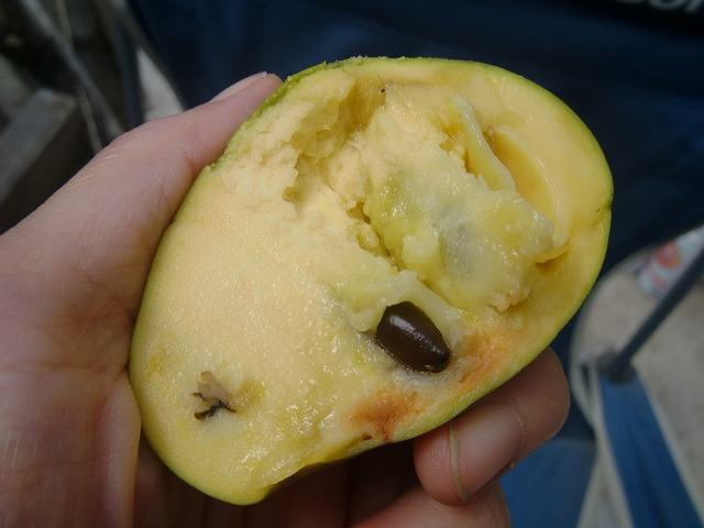 岩太郎さんのおかげで私達は実を食べる事が出来る。熟して落ちれば食べ頃だと聞いていたのでまだかなーと毎日楽しみにしておりました。台風前にポポーの木の下で草刈りをしていると目の前に、たわわに実ったポポーの実。「落ちて来い」「落ちて来い」と思っていたらボトッと背後で音がする。振り向いて見ると熟したポポーの実ひとつ。